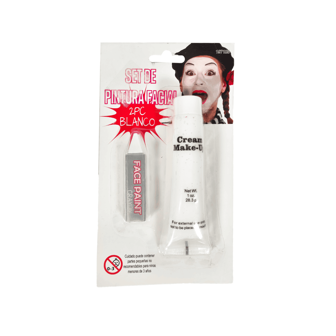 Pintura blanca cremosa, contiene 28.3g. Inclye un crayón blanco para detallar. Es fácil de usar, sueve, se puede aplicar con los dedos o pincel. Se remueve con agua y jabón.