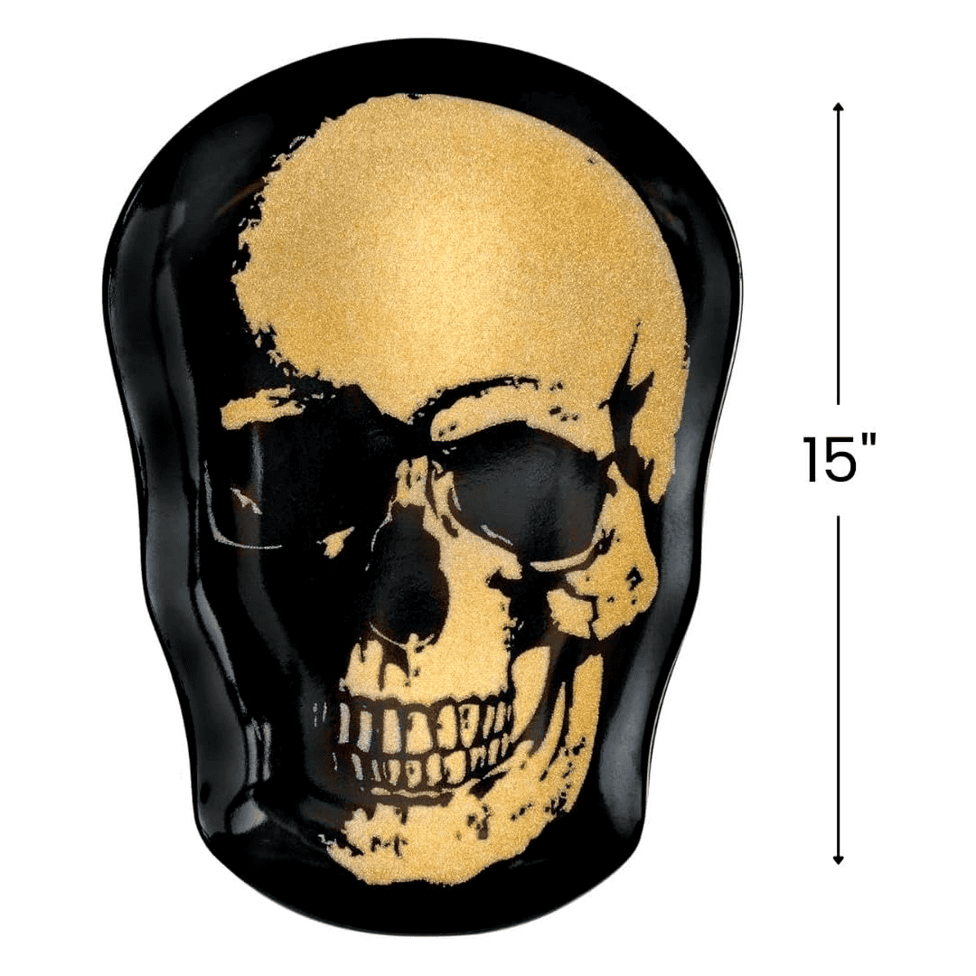 Plato de calavera dorada (tamaño de15 pulgadas), lujoso plato de melamina dorada y negra, perfecto para fiestas temáticas, eventos y celebraciones (1 unidad).
