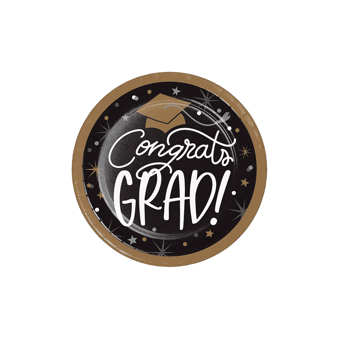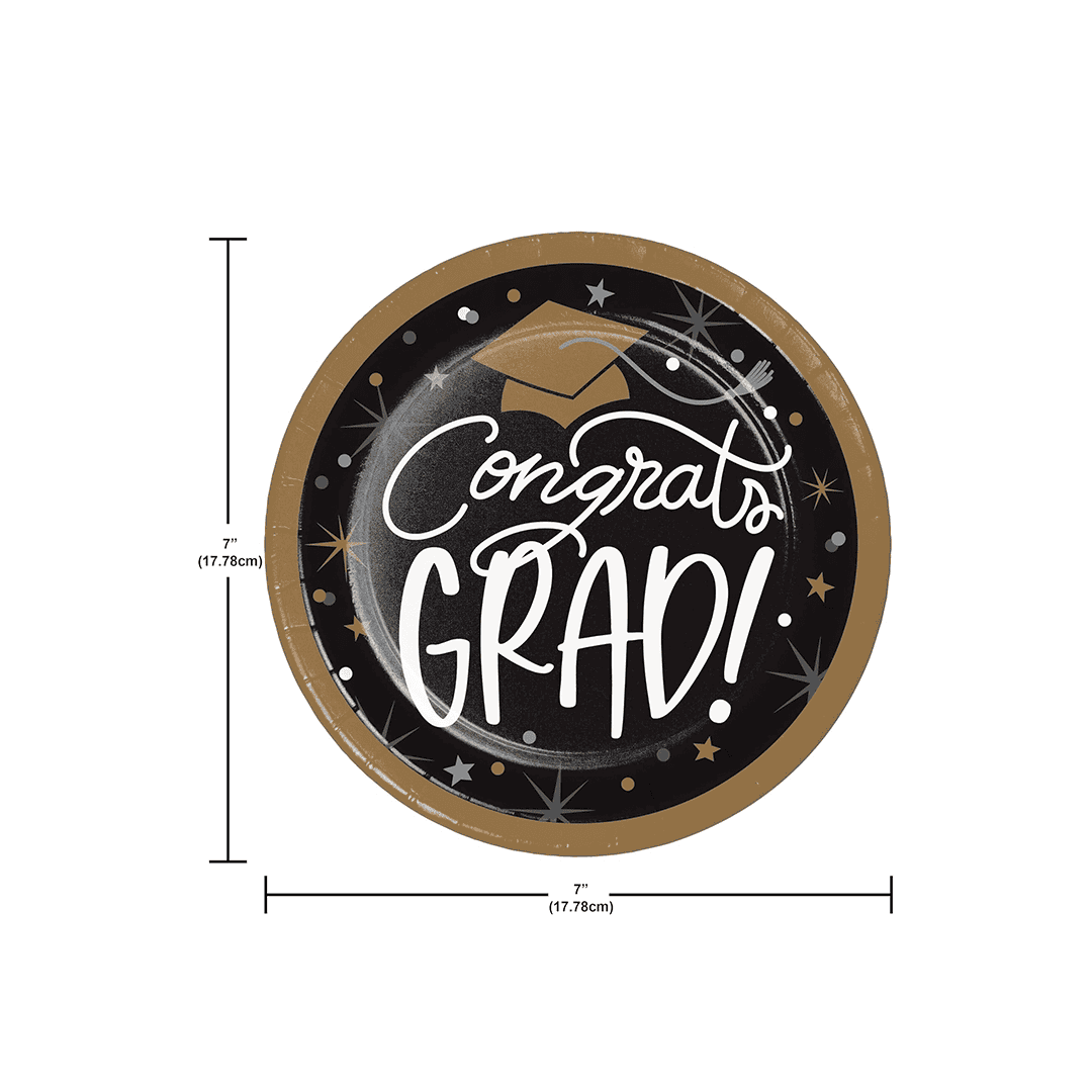 Platos de postre redondos de 7 pulgadas de graduación. Diseño elegante negro con dorado, Congrat Grad!. 8 unidades.