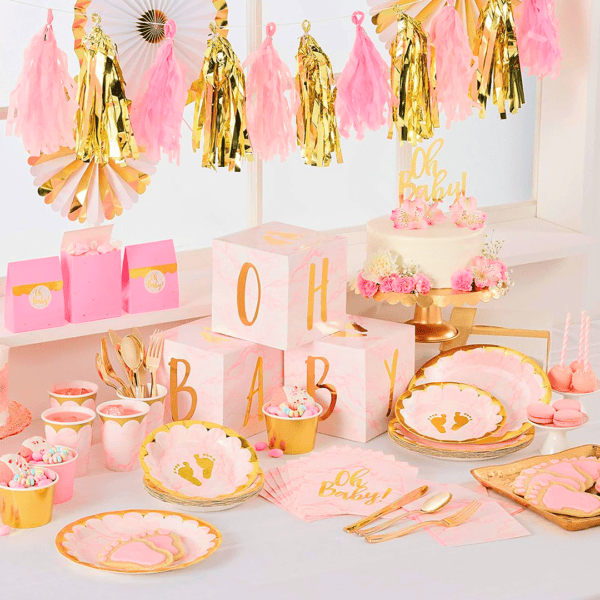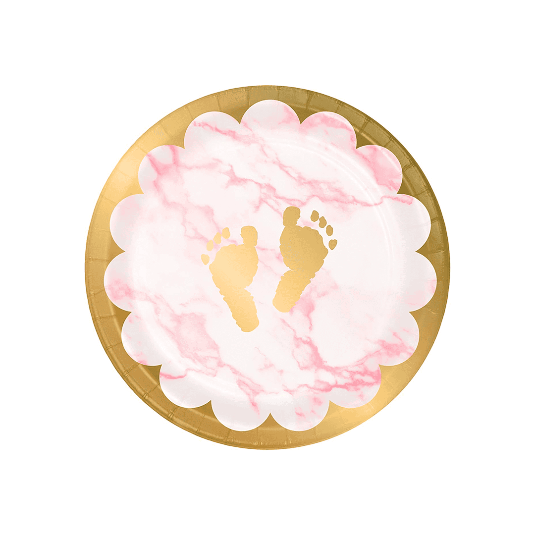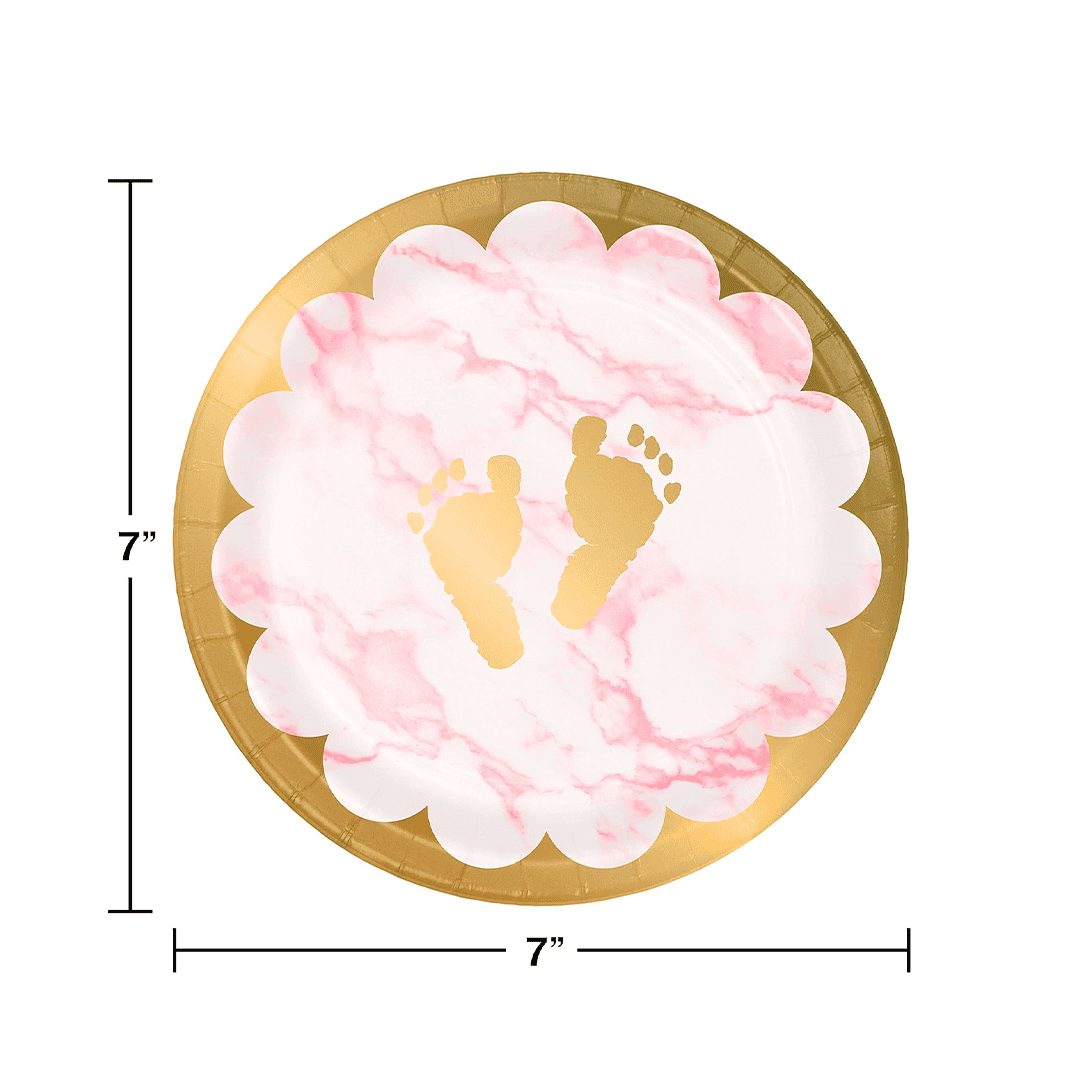 Platos de postre con huellas de mármol para baby shower, 7 pulgadas, rosa, blanco y dorado. Paquete de 8 unidades.