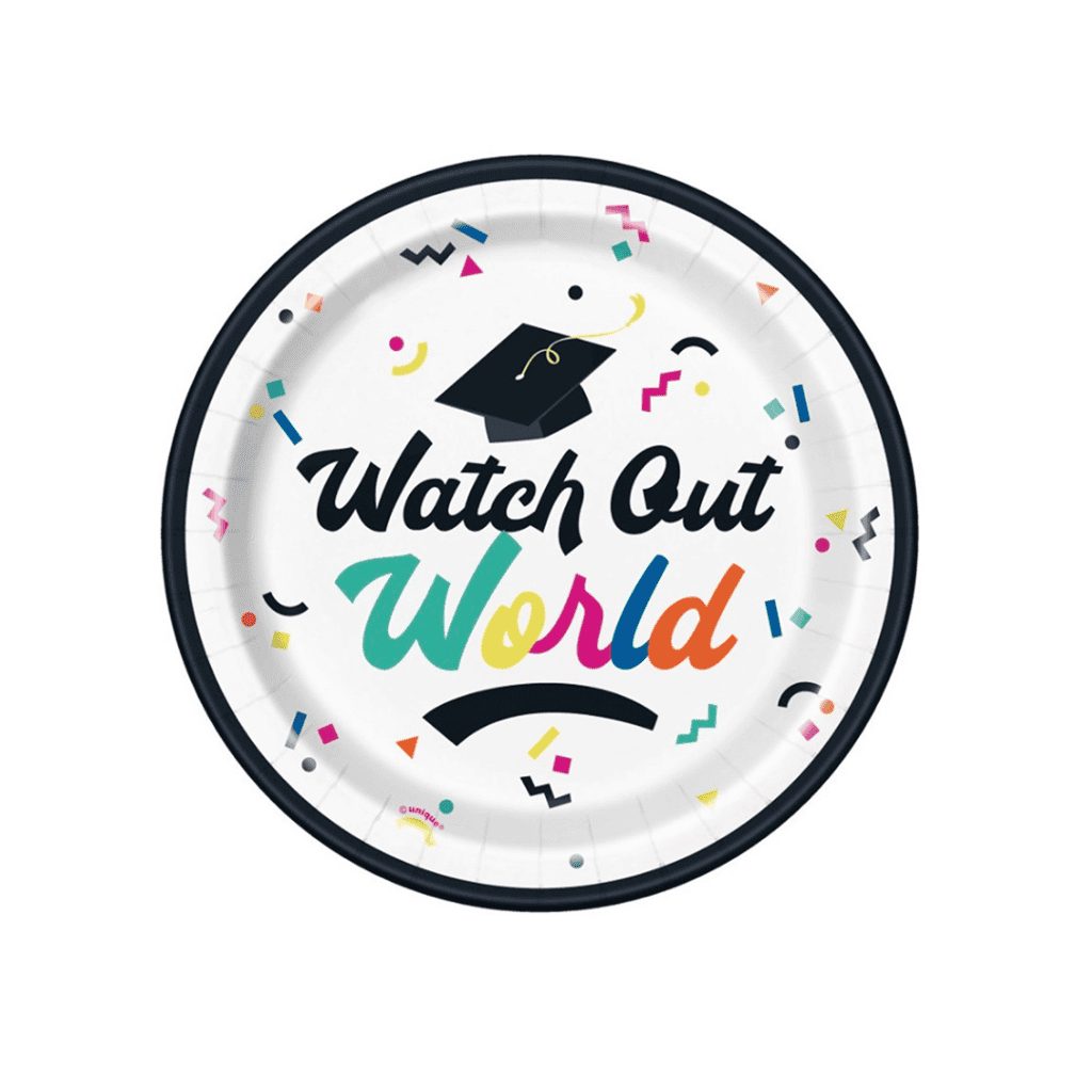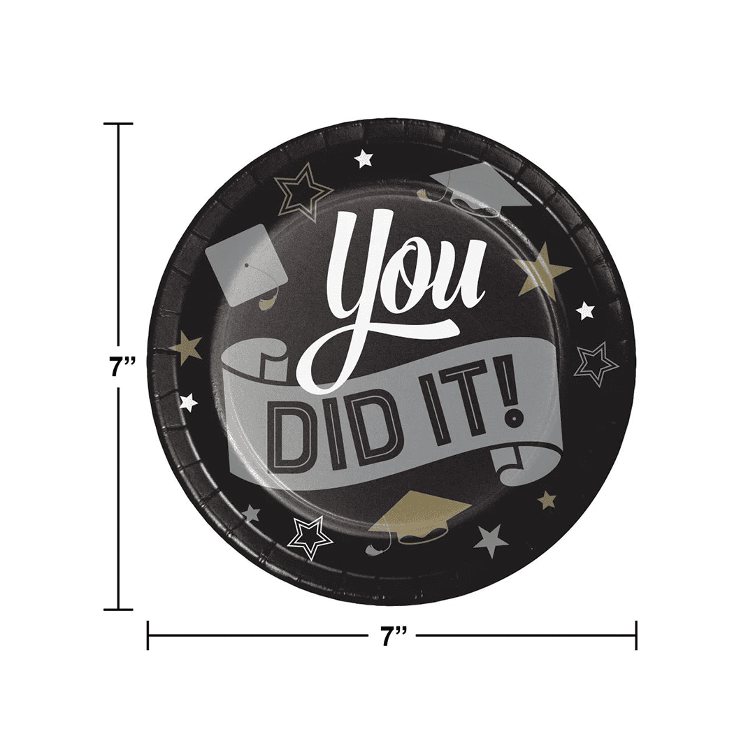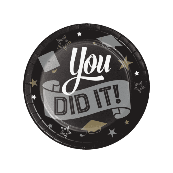 Plato pequeño para graduación. color negro con detalles dorados y plateados. Diseño You did it!. Tamaño: 7 pulgadas. 8 unidades