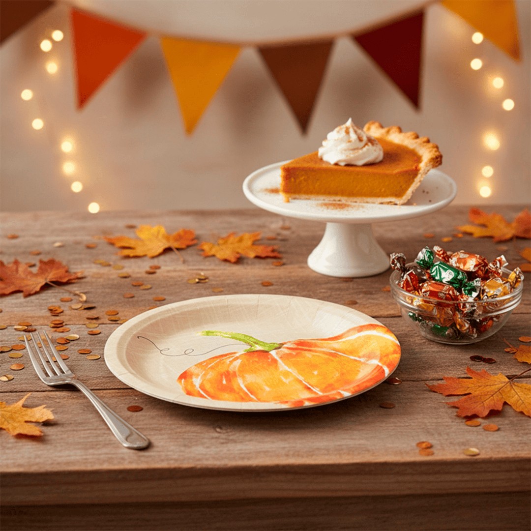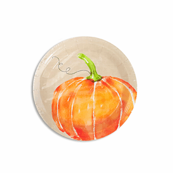 Platos redondos de 9″ con diseño de calabaza en estilo acuarela