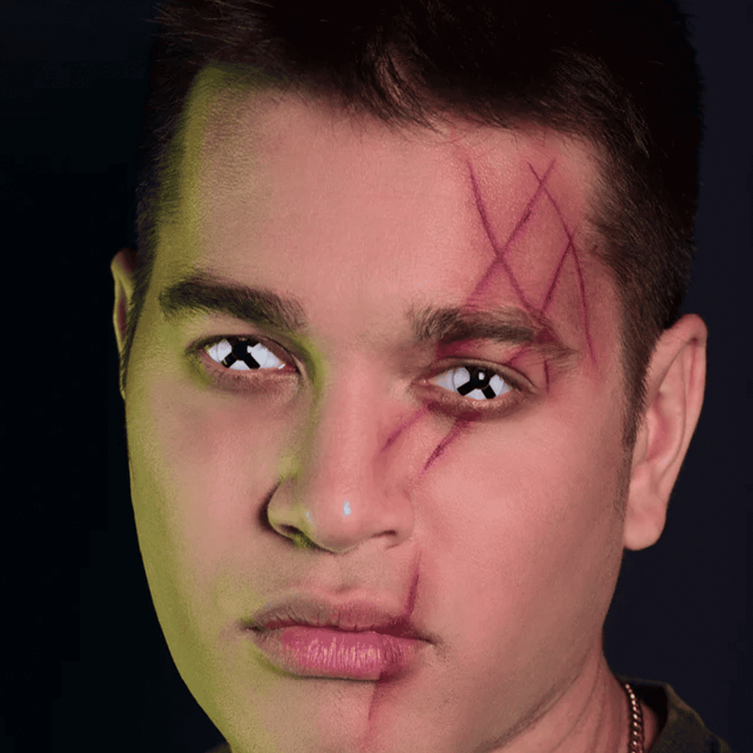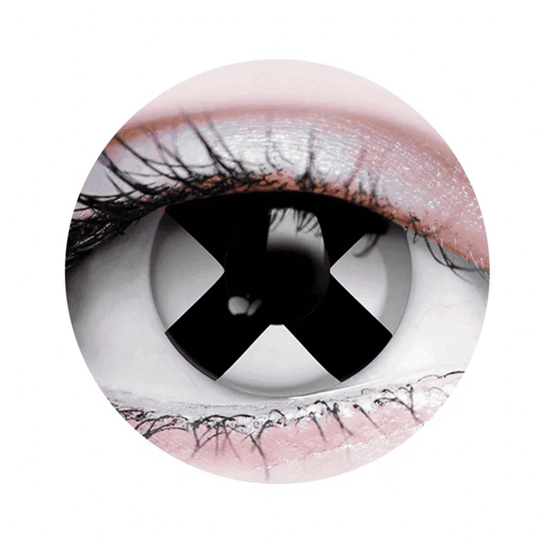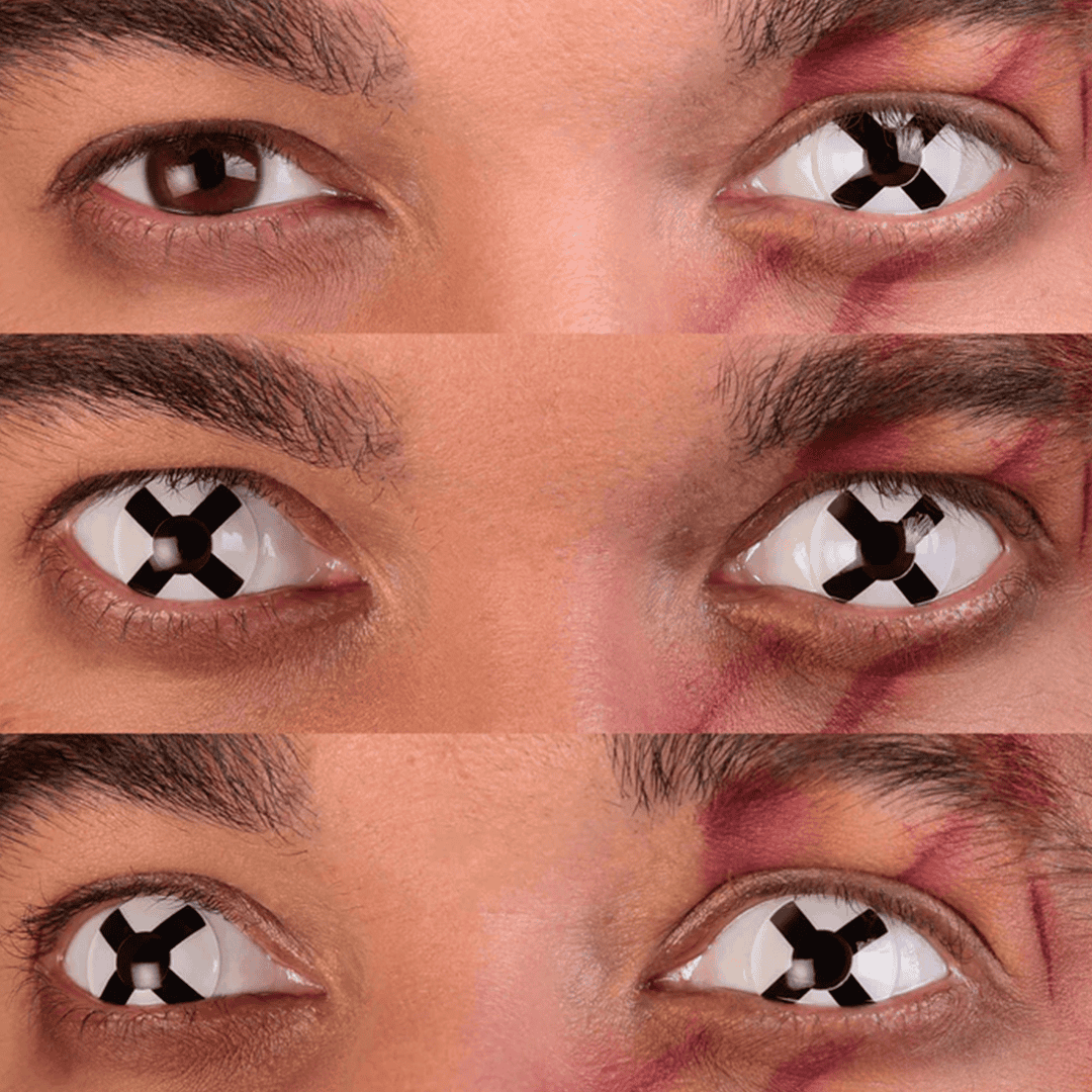 El diseño de lentes de contacto DEADMAN presenta una base blanca opaca y una “X” de borde a borde a través de la pupila transparente. U-886