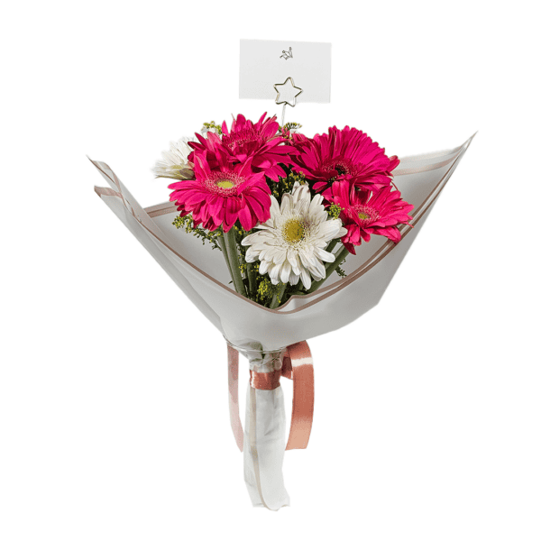 Ramo de 8 Gerberas naturales de colores surtidos incluye: 8 Gerberas, acompañado de follaje, papel coreano Premium, listón, y tarjetita. Nota: El color de las flores, papel y listón puede variar según disponibilidad en tienda. El precio de los ramos puede variar según temporada del día de cariño o día de la madre, el pedido se envía con 1 día de anticipación, no se realizan entregas el mismo día; No se cuenta con envíos a departamentos.