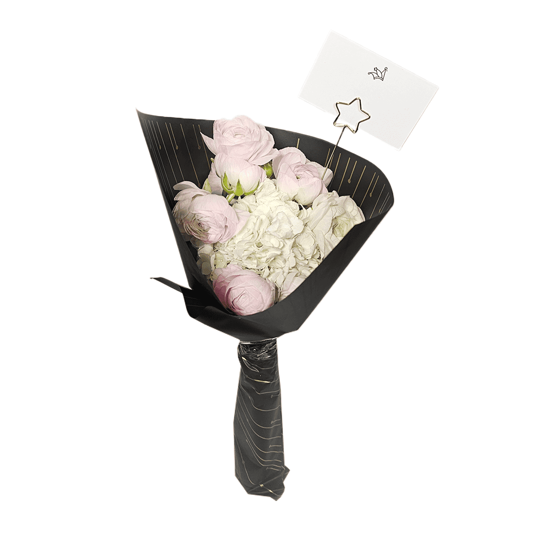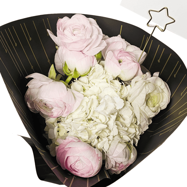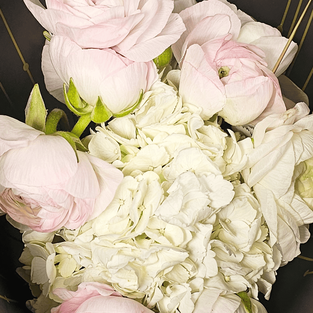 Ramo de peonias con hortensias naturales, incluye: 9 peonias y una hortensia, papel coreano Premium, listón, y tarjetita. Nota: El color de las flores, papel y listón puede variar según disponibilidad en tienda. El precio de los ramos puede variar según temporada del día de cariño o día de la madre, el pedido se envía con 1 día de anticipación, no se realizan entregas el mismo día; No se cuenta con envíos a departamentos.