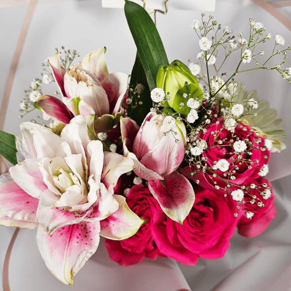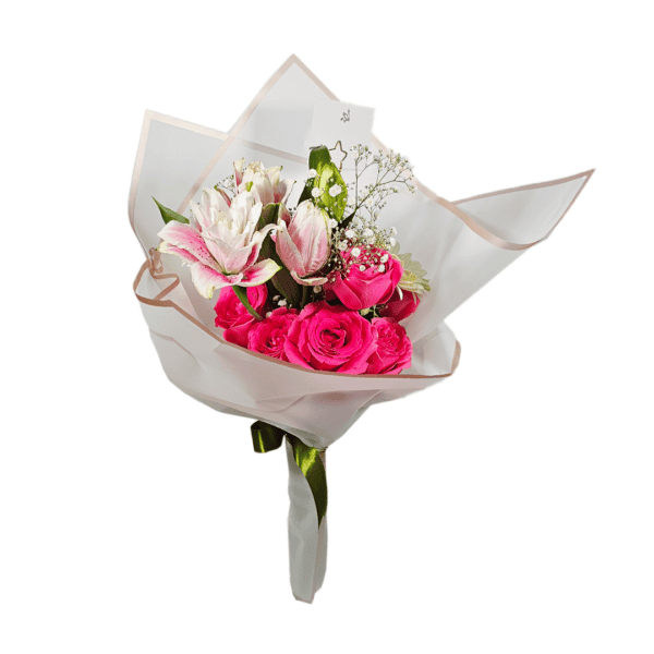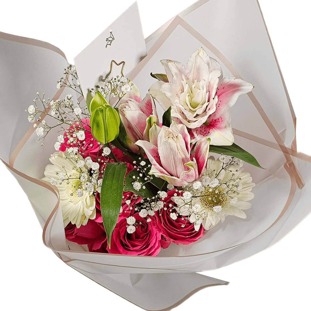 Ramo surtido lirios, rosas y gerberas naturales, incluey: 5 rosas importadas, 4 lirios y 2 Gerberas, acompañado de Baby’s Breath, papel coreano Premium, listón, y tarjetita. Nota: El color de las flores, papel y listón puede variar según disponibilidad en tienda. El precio de los ramos puede variar según temporada del día de cariño o día de la madre, el pedido se envía con 1 día de anticipación, no se realizan entregas el mismo día; No se cuenta con envíos a departamentos.