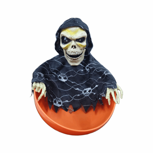 Contenedor de dulces: Recipiente para dulces con movimiento de calavera. útil para repartir en Halloween.