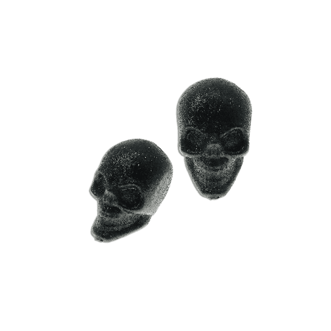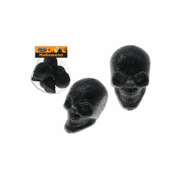 Calaveras negras con gliter, paquete de 6 calaveras con glitter de 7 cm (largo) x 4,5 cm (alto).