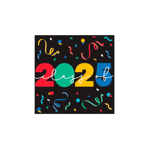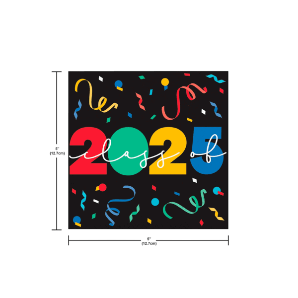 Paquete de 16 unidades. Servilletas de graduación. Diseño Class of 2025, color negro con detalles multicolor. Tamaño: 5 pulgadas.