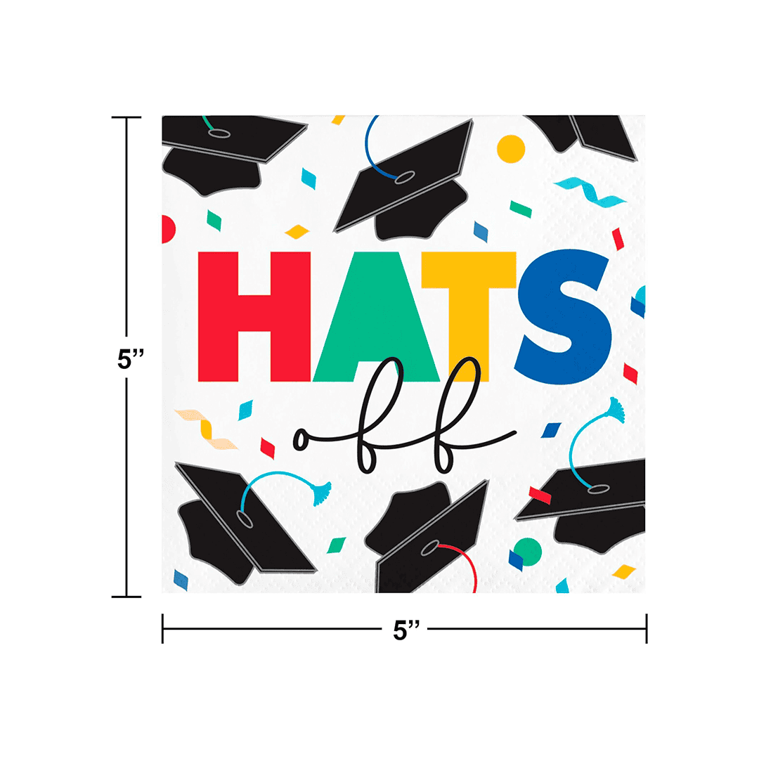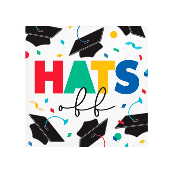 Paquete de 16 unidades. Servilletas de graduación. Diseño HATS off con confeti multiclor y birretes. Tamaño: 5 pulgadas.