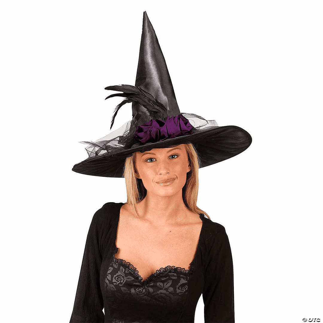 Accesorio de disfraz de sombrero de bruja negro con plumas elegantes y rosa morada.