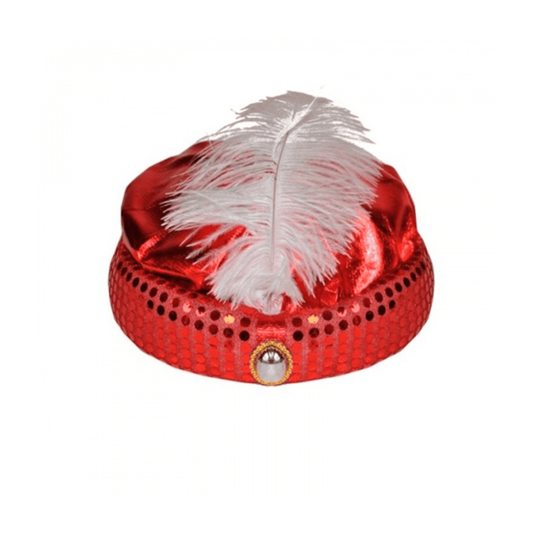 Sombrero turco decorado con lentejuelas, broche y pluma.