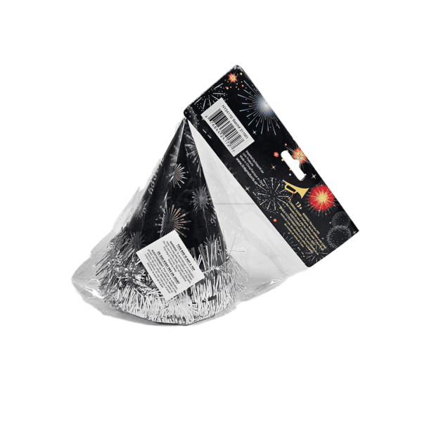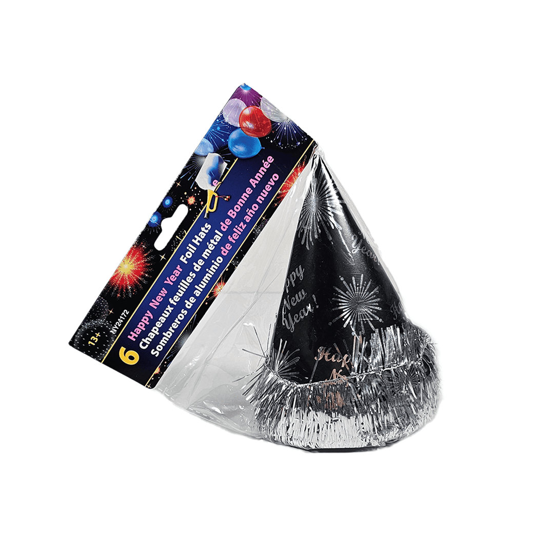 Sombreros fiesta año nuevo foil color negro con plateado, paquete de 6 unidades.
