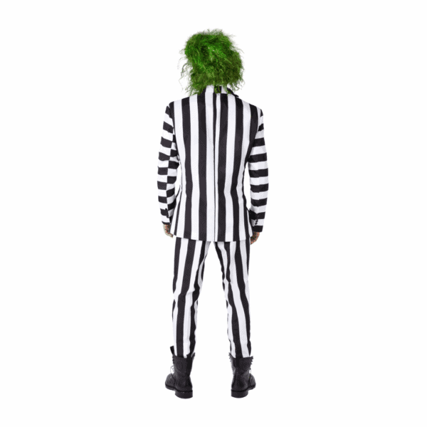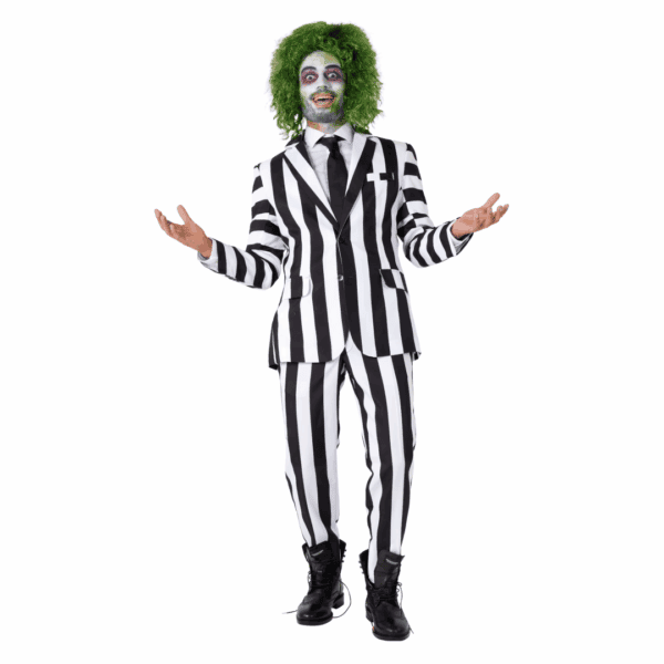 Disfraz talla L. Transfórmate en el excéntrico y travieso personaje con este traje de Beetlejuice. Con su icónico diseño de rayas blancas y negras, este traje captura la esencia única del famoso fantasma. Perfecto para eventos de cosplay, fiestas temáticas o Halloween, te permitirá destacar con un look divertido y extravagante. ¡Invoca a Beetlejuice con estilo y prepárate para una noche llena de travesuras y risas!