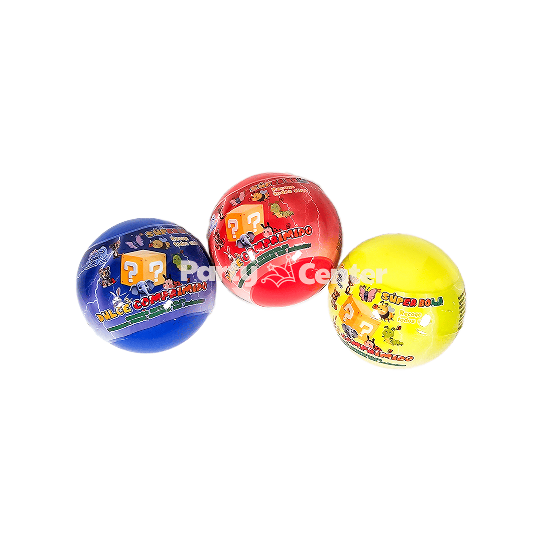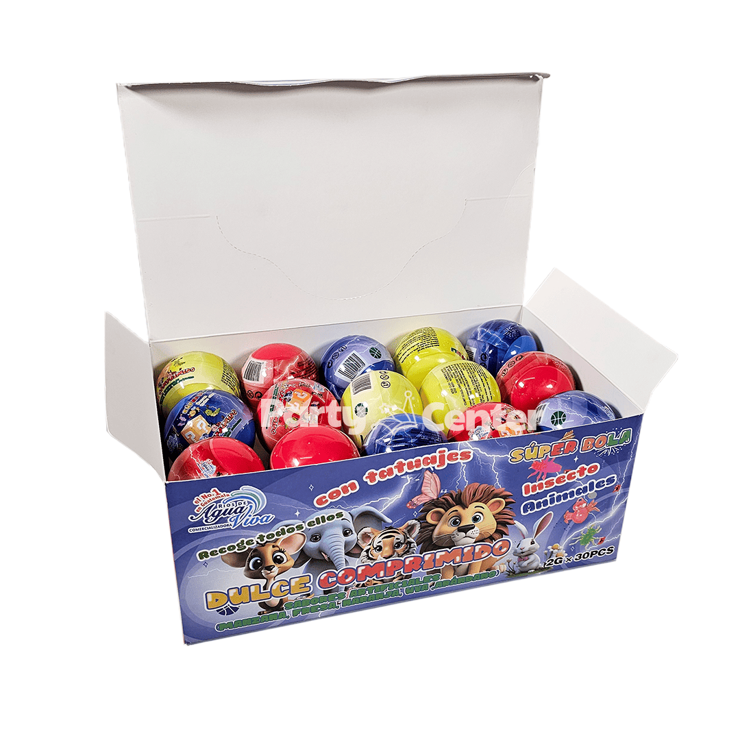 Super bola, esfera con dulce y juguete sorpresa, caja de 30 unidades.
