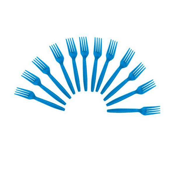 Tenedor Plastico 16cm color azul calro, paquete de 8 unidades.