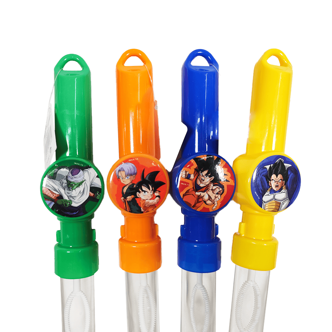 Varita de burbujas Dragon Ball, disponible en 4 colores, amarillo, verde, naranja o rosado, diseño surtido. 1 Unidad. Nota: Este producto es de presentación surtida, por lo que podrías recibir cualquiera de sus variaciones. Si prefieres un diseño específico, indícalo en tu pedido; se enviará según disponibilidad.